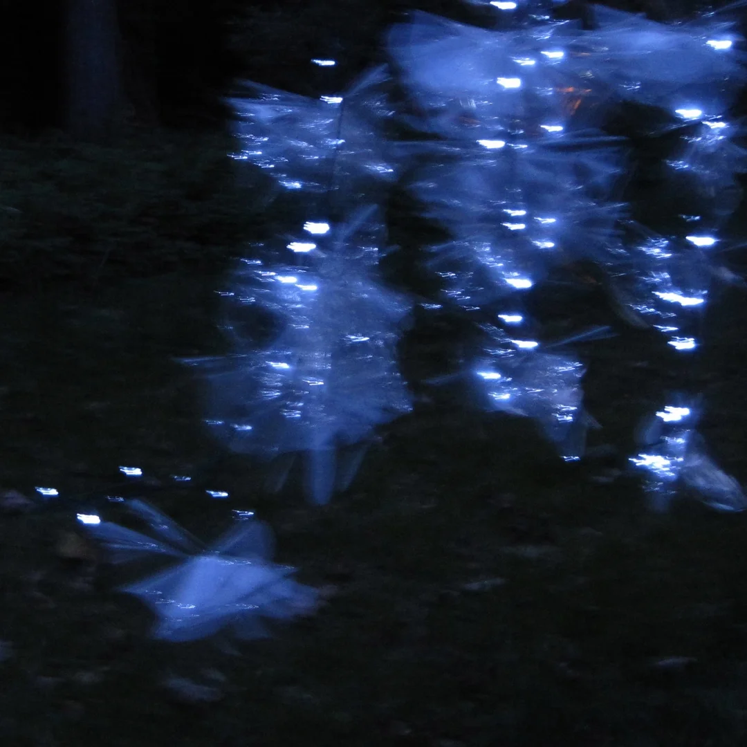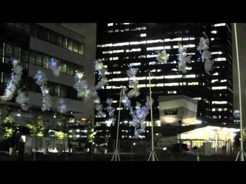 Reflective, hand-made, plastic film birds are suspended from high-tech non-metallic rope. This lightweight super-structure allows the birds to “fly”, both individually and collectively, as the flock is activated by the interaction of the individual birds in response to changing environmental conditions of light and wind. The reflective nature of each bird allows it to maintain its own identity within the flock.