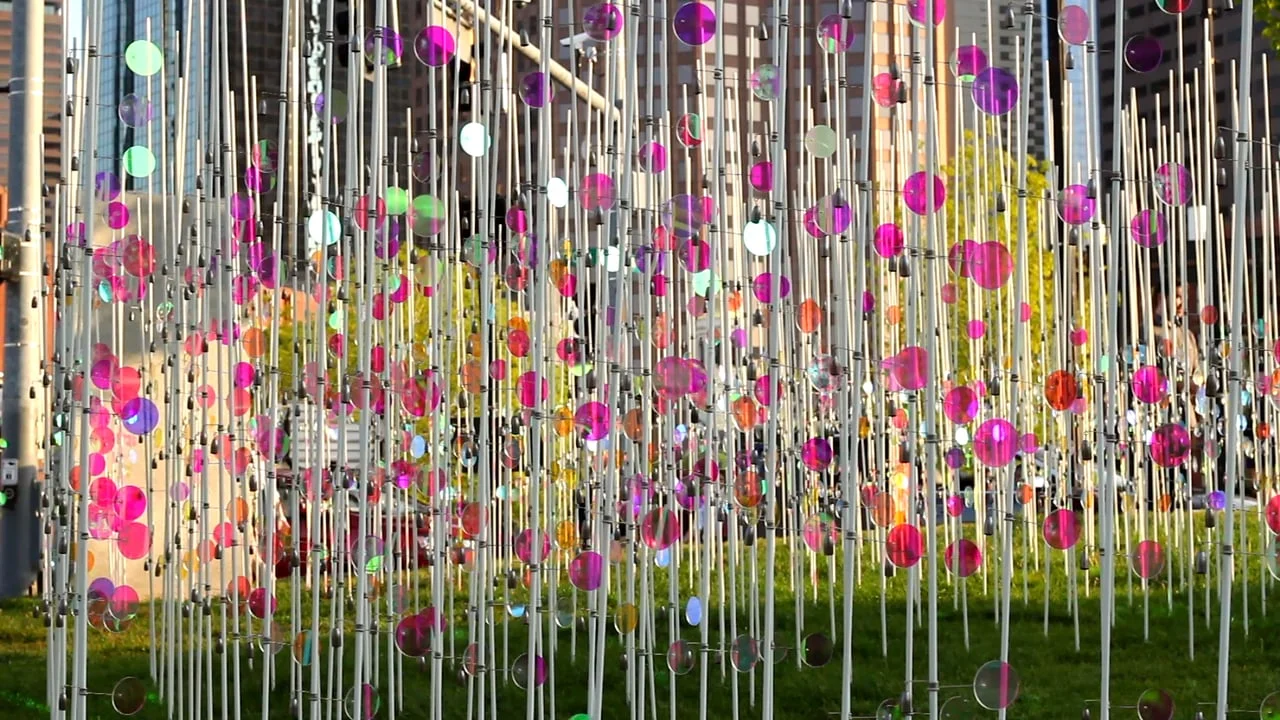 Two serpentine-like mounds were created using a pvc pipe staked to the ground. Thousands of iridescent film tabs were then woven through the frames, creating a dynamic surface of color and light.